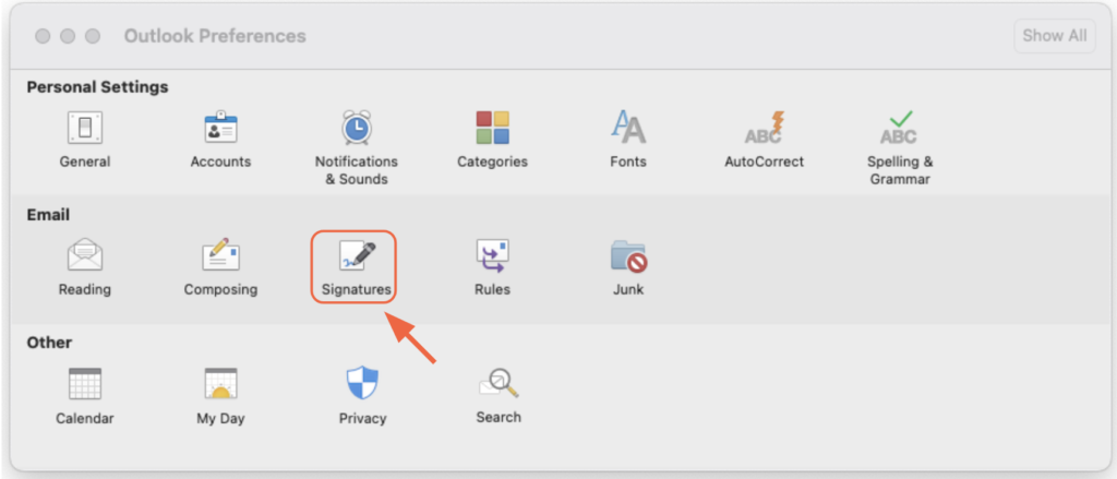 In the Outlook Preferences window, look under the Email section and click on “Signatures.”