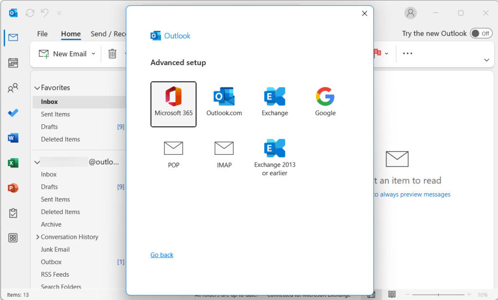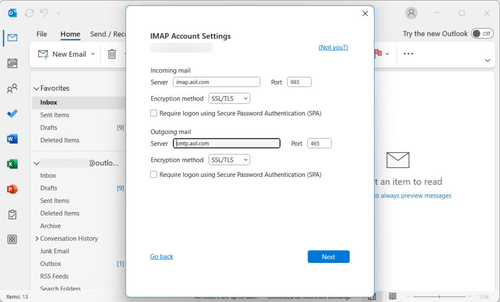 - If prompted, select IMAP as the account type to ensure emails sync properly between Outlook and the server.