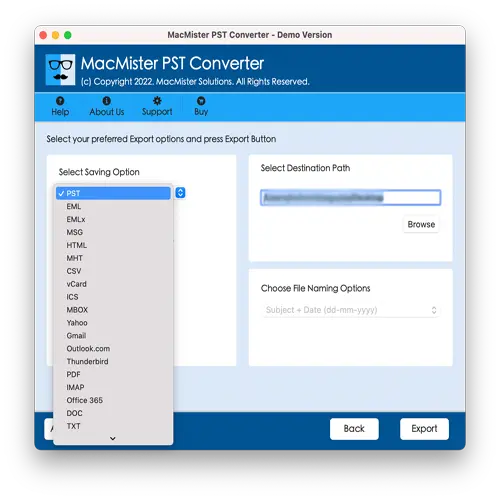From the list of available export formats, choose MBOX. Also, set the destination path where you want the converted files to be saved.